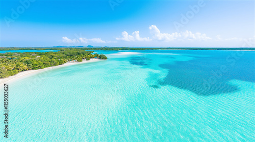 Fototapeta premium A tropical beach with crystal-clear turquoise water and white sandy shores under a bright blue sky. Ultimate vacation and paradise imagery with copy space.