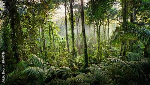 Fototapeta premium a tropical forest with dense greenery tall trees