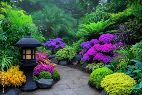 © Thammarong, Obraz premium A tropical garden in Naples, Florida, with colorful orchids and exotic plants blooming in the sunshine