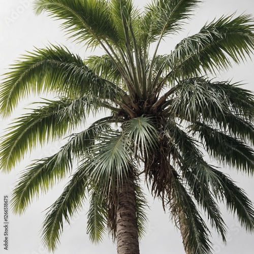Fototapeta premium A tropical palm tree with long, curved fronds on a pure white background.