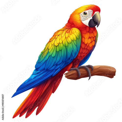© Aventurine, Fototapeta premium A tropical parrot, perched on a branch, stylized cartoon, vibrant rainbow colors, isolated on white background.