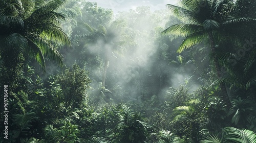 Obraz premium A tropical rainforest with dense vegetation and mist rising from the canopy