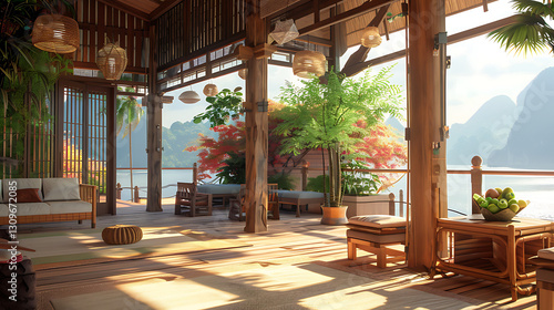 Obraz premium A tropical resort villa interior with bamboo furnishings and ocean breezes