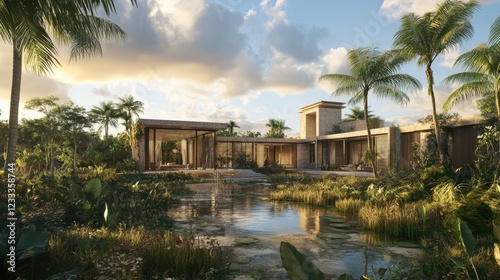 Obraz premium A tropical villa designed with open-air architecture and expansive glass walls.