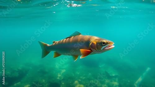 Naklejka premium A trout glides through crystal-clear waters in a serene underwater scene with...