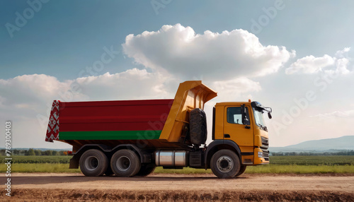 Fototapeta premium A truck adorned with the Belarus flag parked at a quarry, symbolizing American construction. Capturing the essence of building and development in the Belarus