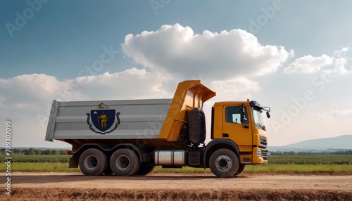 Fototapeta premium A truck adorned with the Massachusetts flag parked at a quarry, symbolizing American construction. Capturing the essence of building and development in the Massachusetts