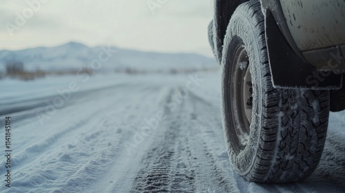 Naklejka premium a truck driving down a snowy road with a mountain in the background