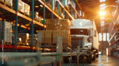 Naklejka premium A truck is being loaded with pallets in a large warehouse at sunrise,...