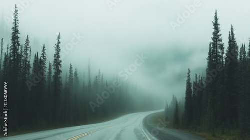 Naklejka premium A truck travels along a winding highway surrounded by fog-laden trees and a...