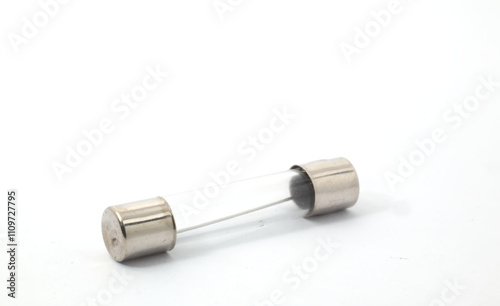 © d'Mhnd, Naklejka premium A tube fuse on a white background. A safety component in a vehicle's electrical system that is shaped like a clear tube and wraps around its safety wire.