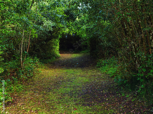 Naklejka premium A tunnel like path through a forest with trees on either side. The path is covered in leaves and dirt and creates drama and tension. Scene in a park.