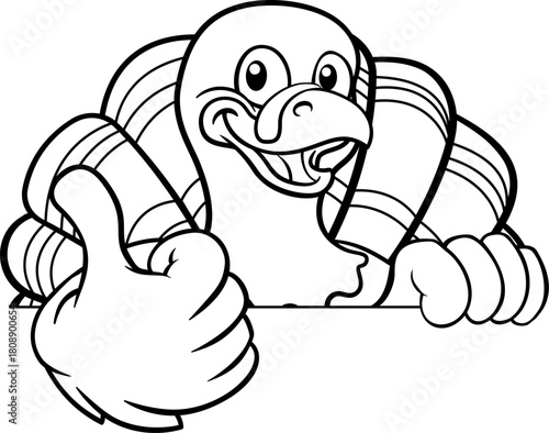 © Christos Georghiou, Fototapeta premium A turkey Thanksgiving cartoon bird Christmas mascot peeking around a sign with copy space