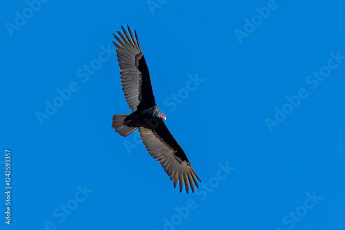 Naklejka premium A Turkey vulture flies in blue sky
