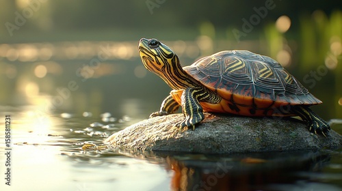 © Dece Std, Obraz premium A turtle basks on a rock in tranquil water, bathed in golden sunlight