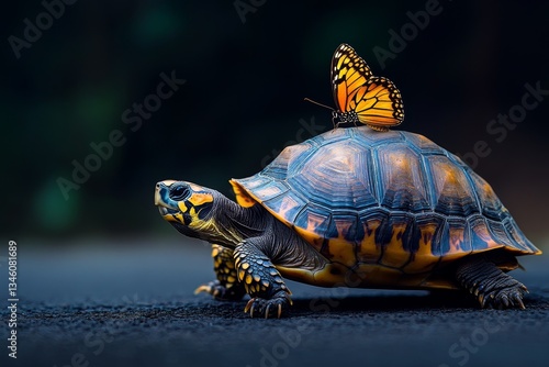 © Thammarong, Obraz premium A turtle crossing a country road, pausing as a butterfly lands on its shell