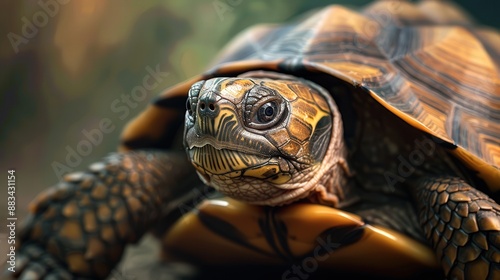 Obraz premium A turtle is shown in a close up. The turtle is brown and orange with a black...