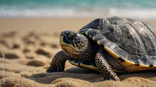 © Neeranat, Obraz premium A turtle moving gracefully on the sandy beach.