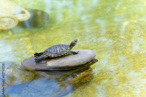 © Нина Кончакова, Obraz premium A turtle on a stone in a decorative pond with its head raised and paws outstretched