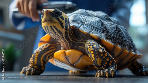 © reza, Obraz premium A turtle on a table with a person holding a tool above it.