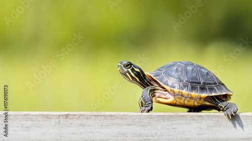 © Mabdul, Obraz premium A turtle resting on a wooden surface with a blurred background.