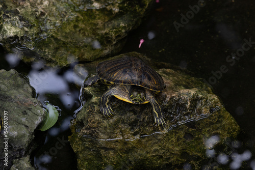 Obraz premium A turtle rests on a mossy rock beside calm water, showcasing its detailed...