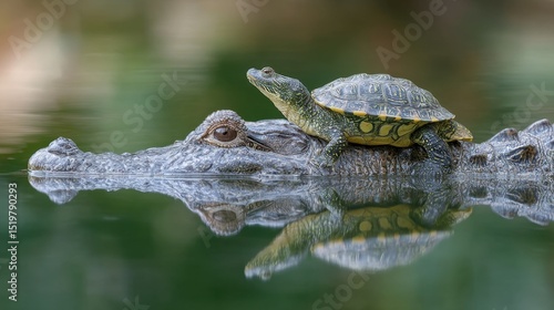 Obraz premium A turtle sits calmly on the back of a crocodile in a serene lake, showcasing...