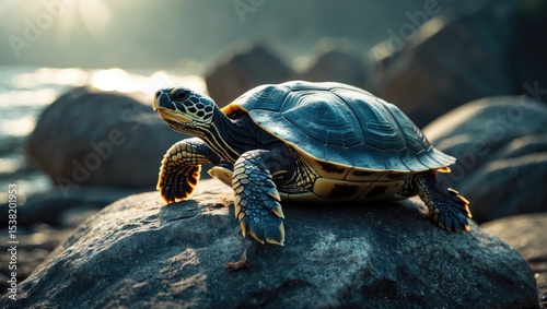 Obraz premium A turtle sunbathing on a rock