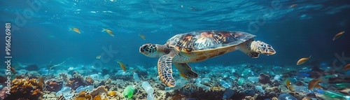 © kornc, Obraz premium A turtle swimming in the ocean with fish swimming around it