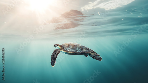 © Watcharin, Obraz premium A turtle swimming in the ocean with the sun shining on it