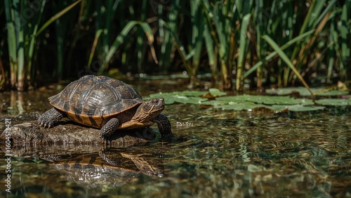 © AkuAku, Obraz premium A turtle unwinding beside transparent shallow water