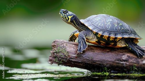 Fototapeta premium A turtle with a black and yellow shell sits on a log in a pond, basking in...