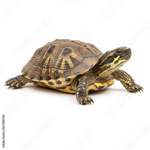 © Aklima, Obraz premium A turtle with a brown and yellow patterned shell on a white background in a studio setting image view