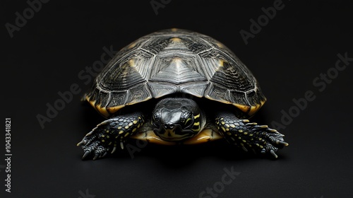© Morning, Obraz premium A turtle with a dark brown and yellow shell is walking on a black surface.