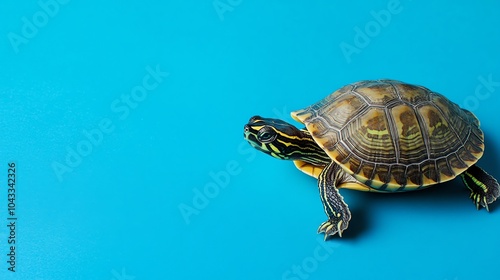© Morning, Obraz premium A turtle with a patterned shell walks on a blue background.