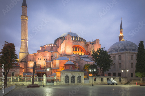Naklejka premium A twilight view from Sultanahmet Park in Istanbul, Turkey of the iconic Hagia Sophia, once a Byzantine Church converted to a mosque by the Ottomans, illuminated at night.