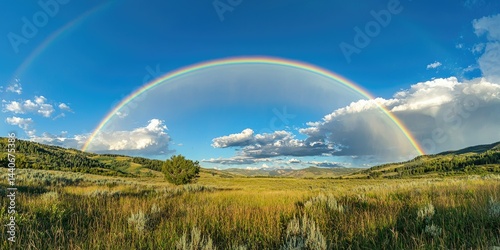 © Pech, Naklejka premium A twin rainbow arcing through a bright blue sky after the rain