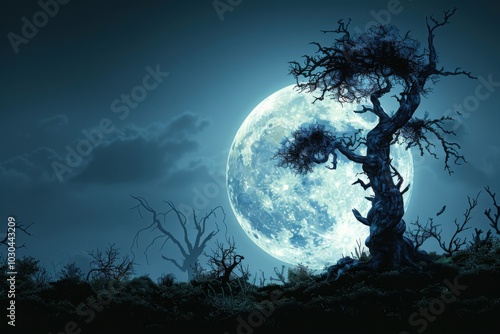 Fototapeta premium A twisted, eerie tree stands in silhouette against a massive full moon in a barren landscape, evoking a haunting and mystical atmosphere.