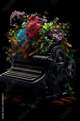 © Oleksandr, Obraz premium A typewriter with a bunch of flowers. Muse. Writer inspiration. Generative AI