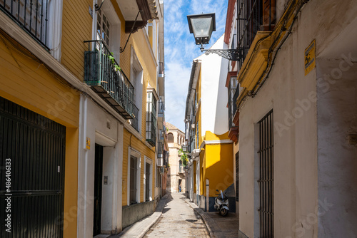 Fototapeta premium A typical narrow street of colorful yellow buildings in the Barrio Santa Cruz area of the Andalusian city of Seville Spain.