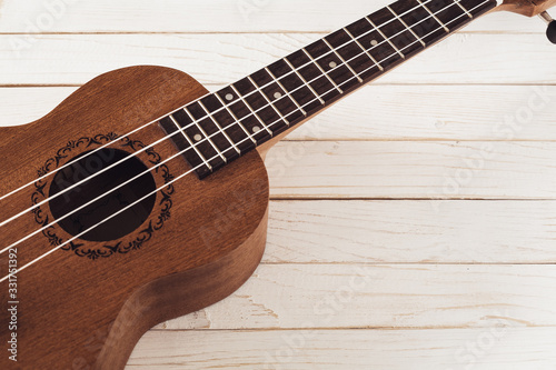 © rymarenko, Fototapeta premium A ukulele with strings on white wooden background