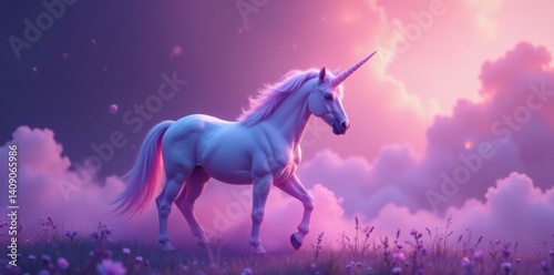 Naklejka premium A unicorn's horn shines with an ethereal glow in a soft lavender mist ,...