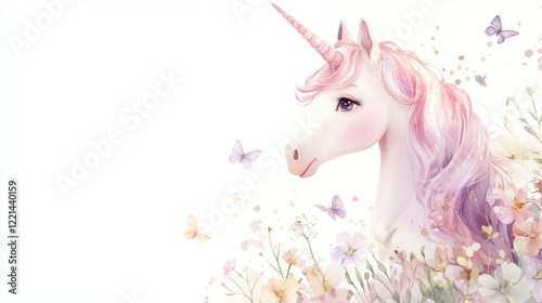 Fototapeta premium A unicorn with a pink mane and a white horn is surrounded by flowers