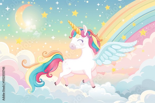 Fototapeta premium A unicorn with a rainbow on its back is flying through the sky