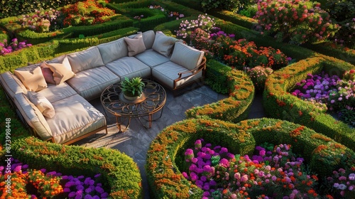 © Sundas, Obraz premium A unique aerial perspective of a garden with interlocking hedge patterns and a secluded sitting area, featuring a soft fabric sofa set and a decorative metal table, nestled among vibrant flowers.
