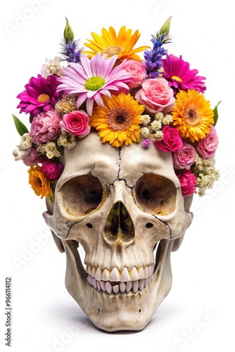 © Rafay, Naklejka premium A Unique Artistic Representation of a Skull Surrounded by Vibrant Flowers for Creative Projects