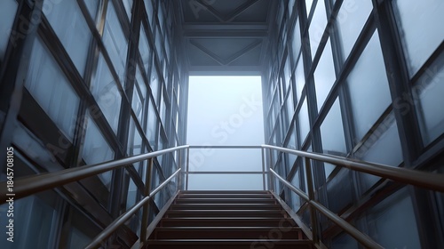 Obraz premium A utilitarian metal staircase ascends into a bright foggy opening creating a...