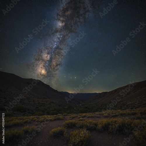 Fototapeta premium A valley under a blanket of stars with the Milky Way arching overhead.