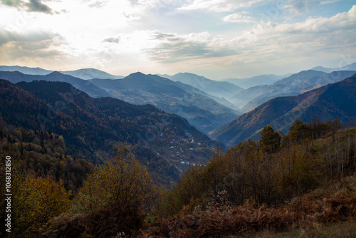 © Yauhen, Obraz premium A valley view surrounded by mountains on a cloudy day