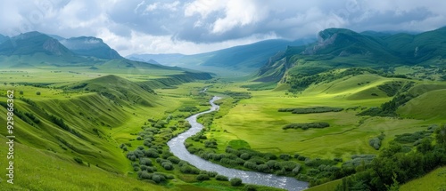 © Viktor, Obraz premium A valley with a river flowing, mountains in the background distantly, and clouds scattering the sky